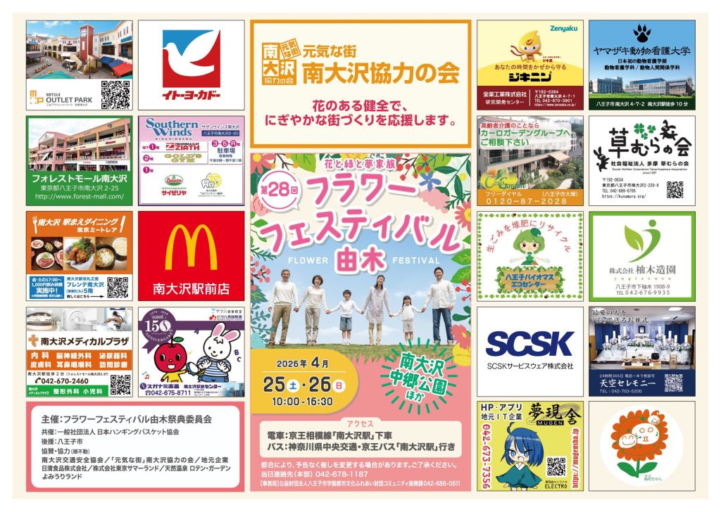 「フラワーフェスティバル由木」は、花と緑と夢家族をテーマに、由木地区19の町会・自治会(注1)と3つの市民センター住民協議会(注2)が主体となり開催するイベントで「八王子まつり」「八王子いちょう祭り」「踊れ西八夏まつり」と共に八王子四大祭りと呼ばれています。