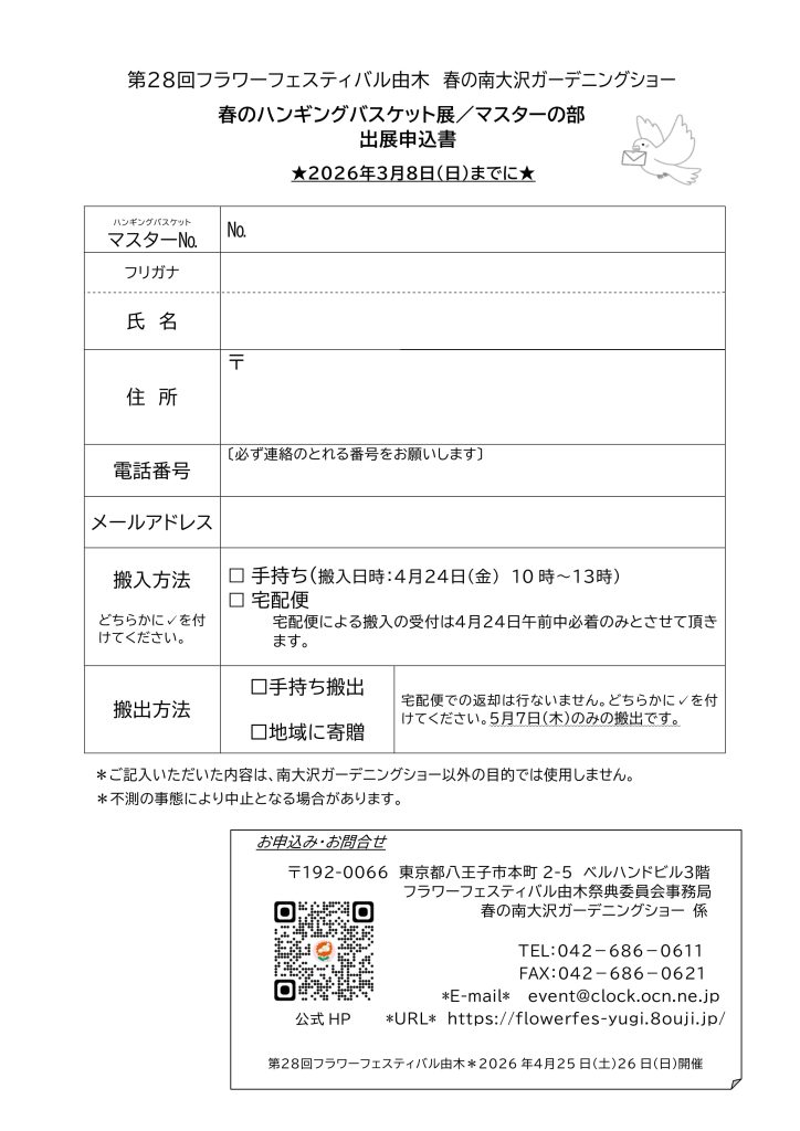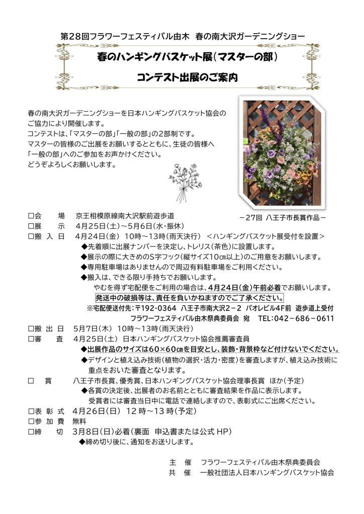 [第28回フラワーフェスティバル由木]春のハンギングバスケット展(マスターの部)コンテスト出展のご案内(3/8締切) 2026 1/17 28news 2026年1月17日 PDFファイル 目次WEBお申し込み このフォームに入力するには、ブラウザーで JavaScript を有効にしてください。ハンギングバスケット・マスターNo. *氏名 *氏名(フリガナ) *〒(郵便番号) *住所 *電話番号(必ず連絡のとれる番号をお願いします) *メールアドレス *搬入方法 *手持ち(搬入日時:4月24日(金) 10~13時)宅急便(4月24日午前中必着のみ)どちらかを選択してください。搬出方法 *手持ち搬出地域に寄贈宅急便での返却は行いません。どちらかを選択してください。5月7日(木)のみの搬出です。注意事項 *以下の注意事項を承諾しました。※ご入力いただいた内容は、南大沢ガーデニングショー以外の目的では使用しません。 ※不測の事態により中止となる場合があります。送信 28news よかったらシェアしてね! URLをコピーしました! URLをコピーしました! 実施報告書を掲載いたしました。 [第28回フラワーフェスティバル由木]春のハンギングバスケット展(一般の部)コンテスト出展のご案内(3/8締切) 関連記事 [第28回フラワーフェスティバル由木]春のコンテナガーデンコンテスト参加団体募集(3/8締切) 2026年1月17日 [第28回フラワーフェスティバル由木]ハンギングバスケット講習会参加者募集(3/25締切) 2026年1月17日 [第28回フラワーフェスティバル由木]春のハンギングバスケット展(一般の部)コンテスト出展のご案内(3/8締切) 2026年1月17日